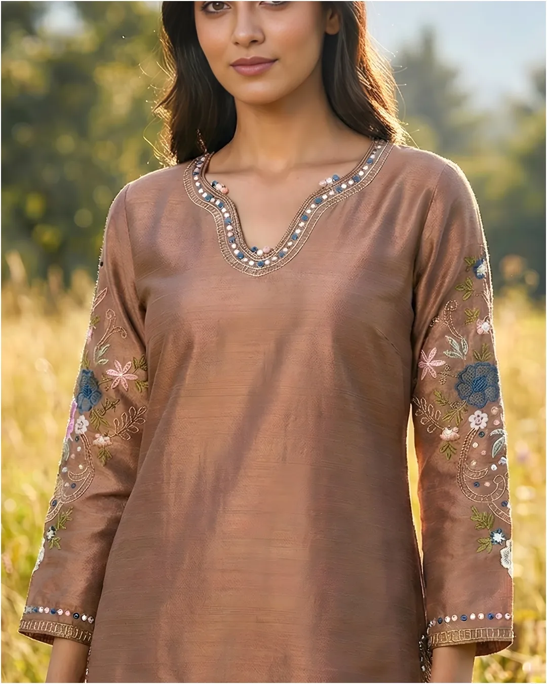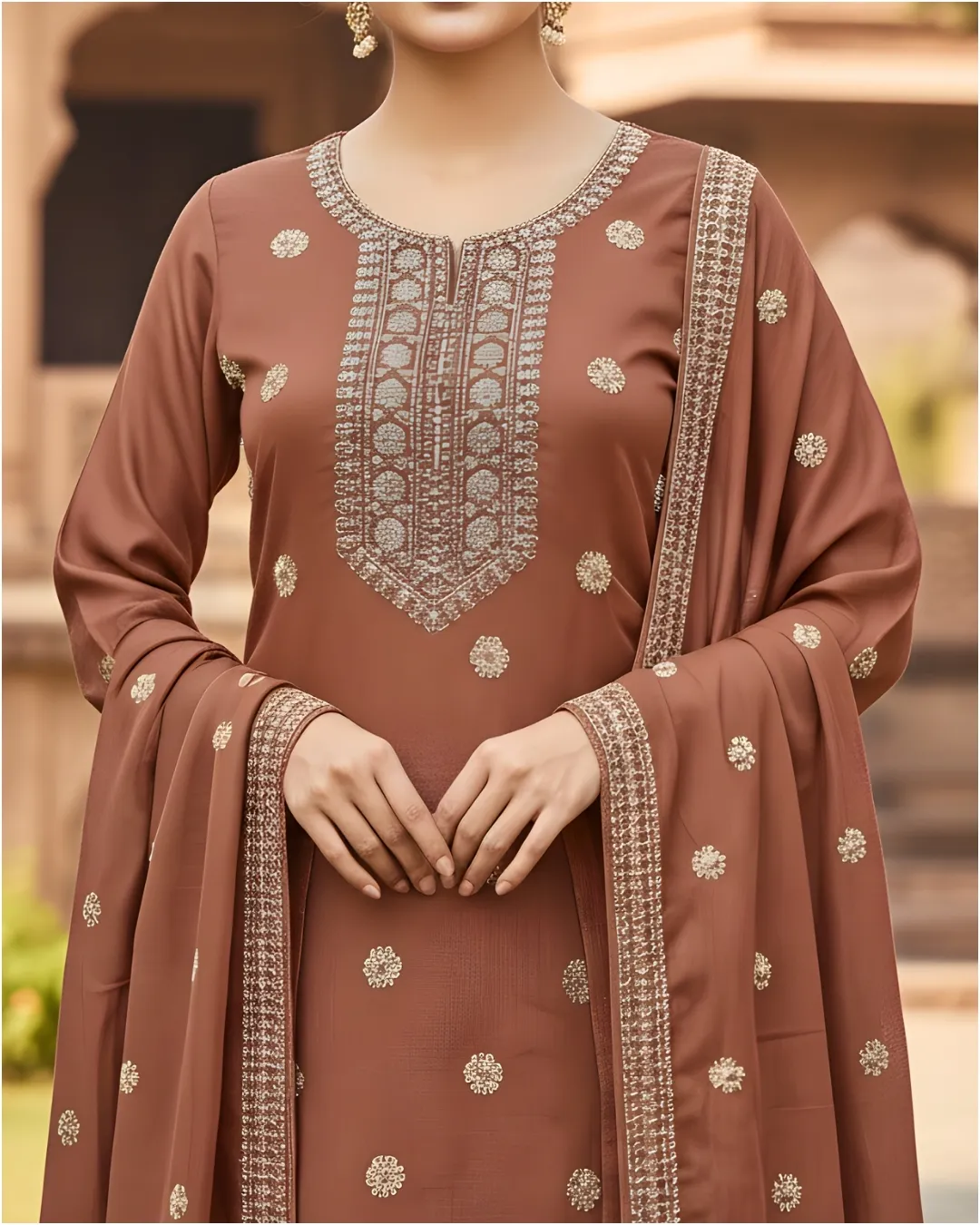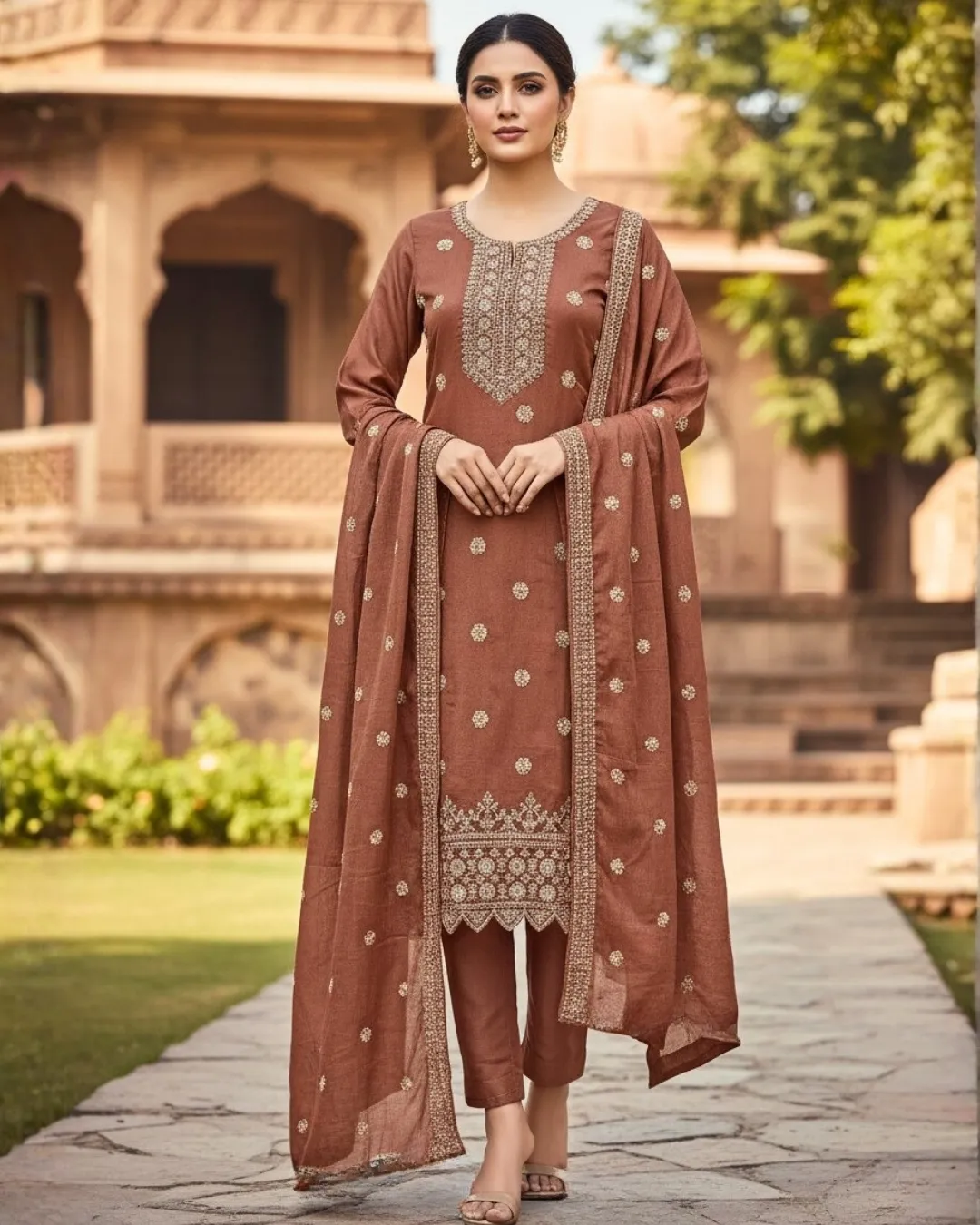 Draped in a rich emerald green hue, this kurta set features intricate gold-toned embroidery along the yoke and delicate motif detailing across the fabric. Paired with straight-fit pants and a gracefully flowing dupatta with ornate borders, the ensemble reflects timeless heritage and refined grandeur. Perfect for festive celebrations, cultural gatherings, and elegant evening occasions.
