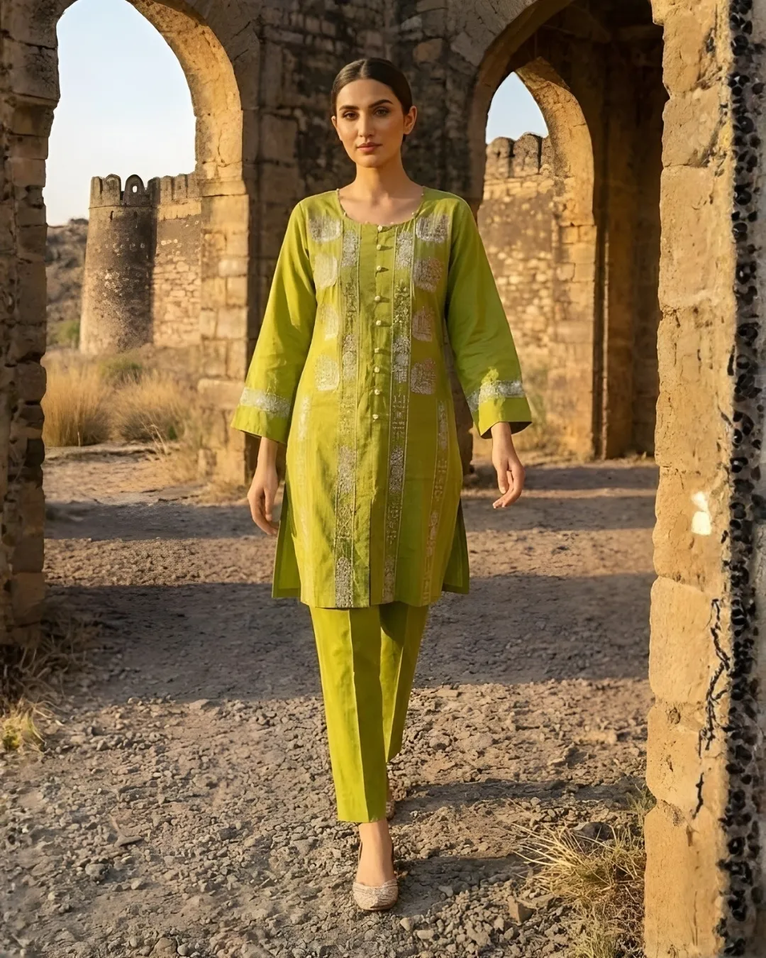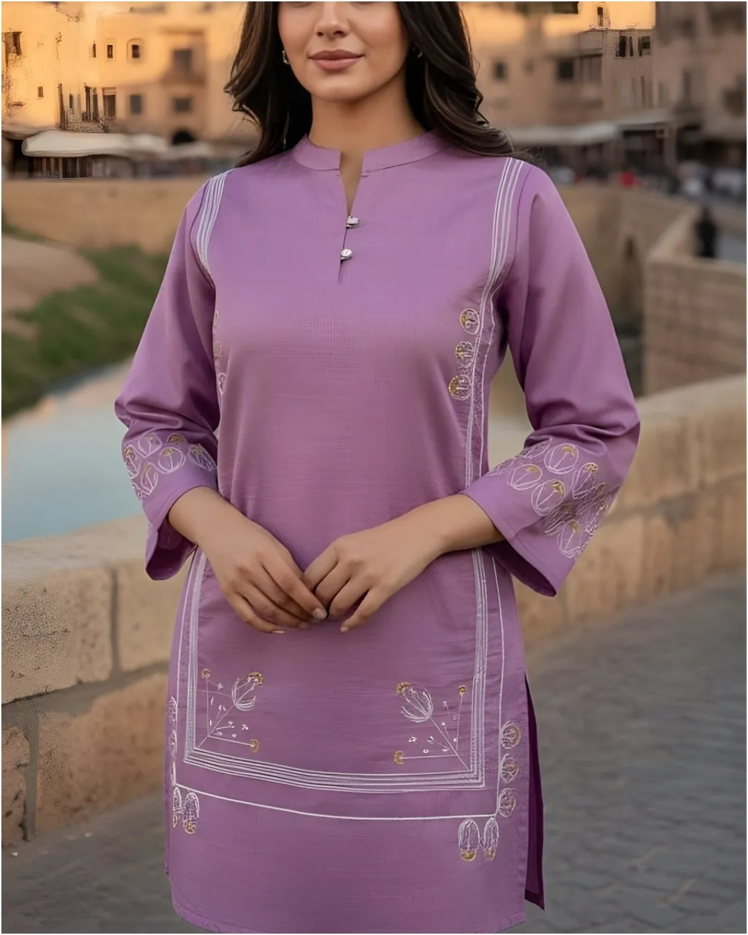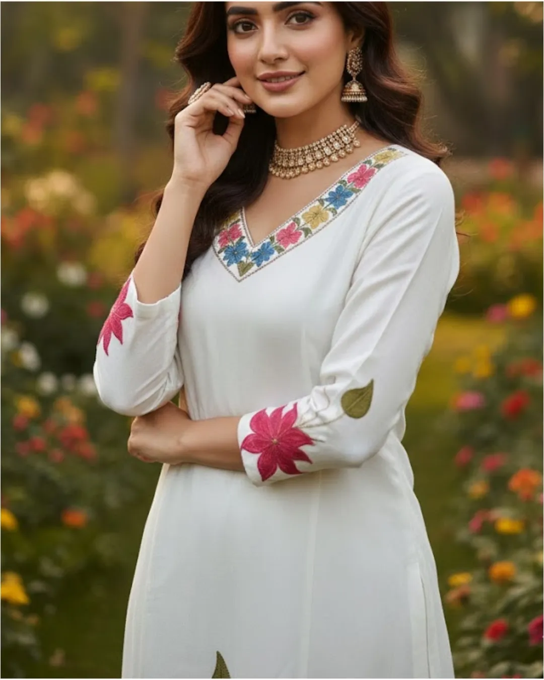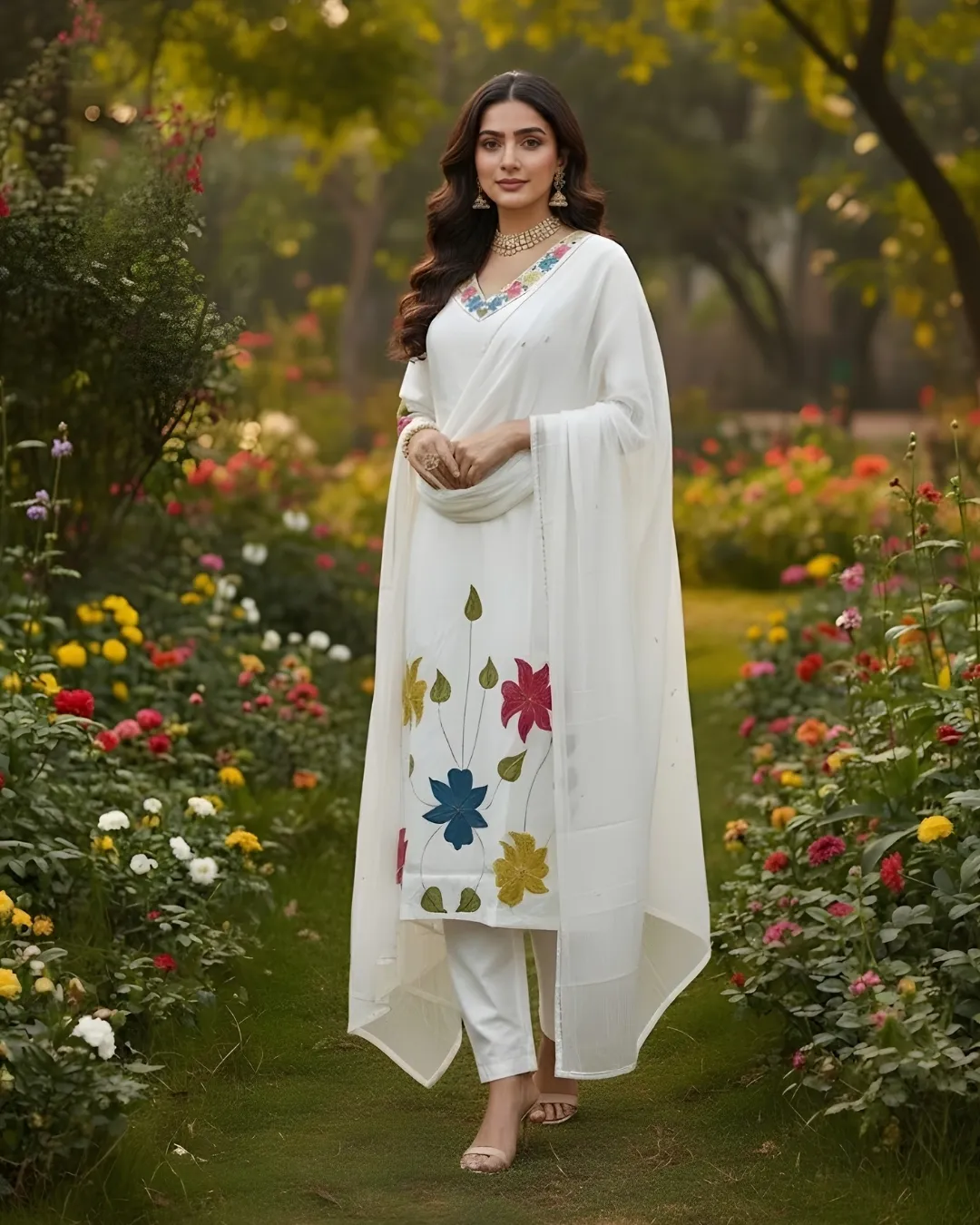 A beautifully crafted ivory Anarkali set that blends grace with comfort. The delicate floral embroidery on the bodice adds a charming touch, while the flowy silhouette creates an effortlessly elegant look. Paired with a striped dupatta for subtle contrast, this outfit is perfect for festive gatherings, daytime celebrations, and special moments. Lightweight, very affordable, and finished with amazing quality for all-day ease and style.