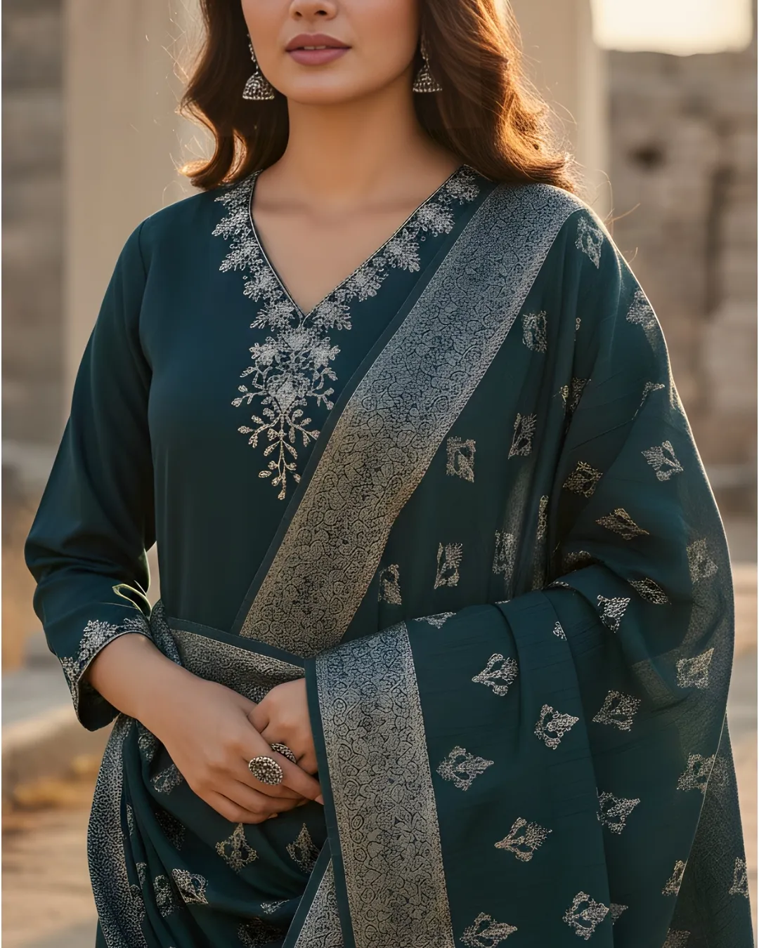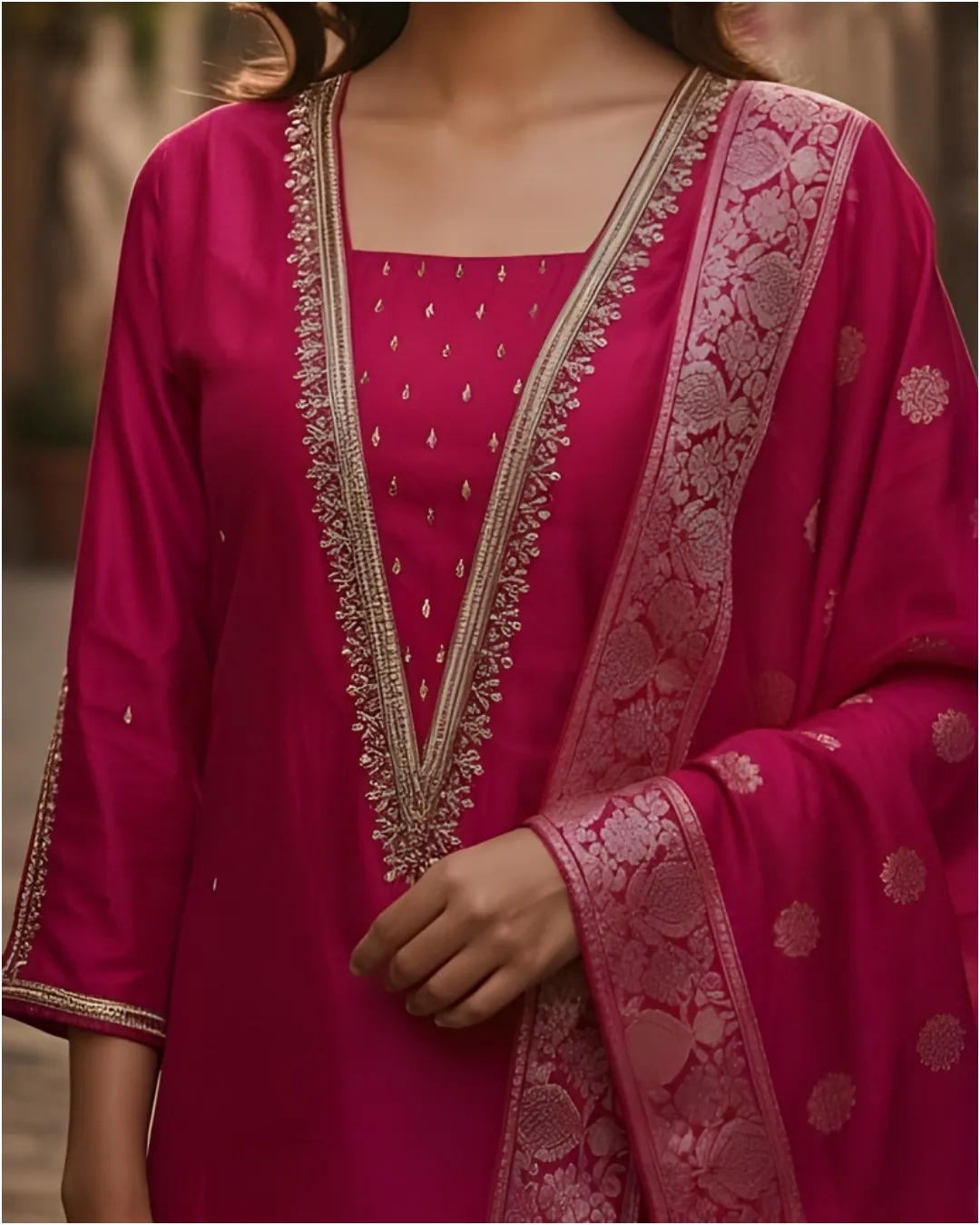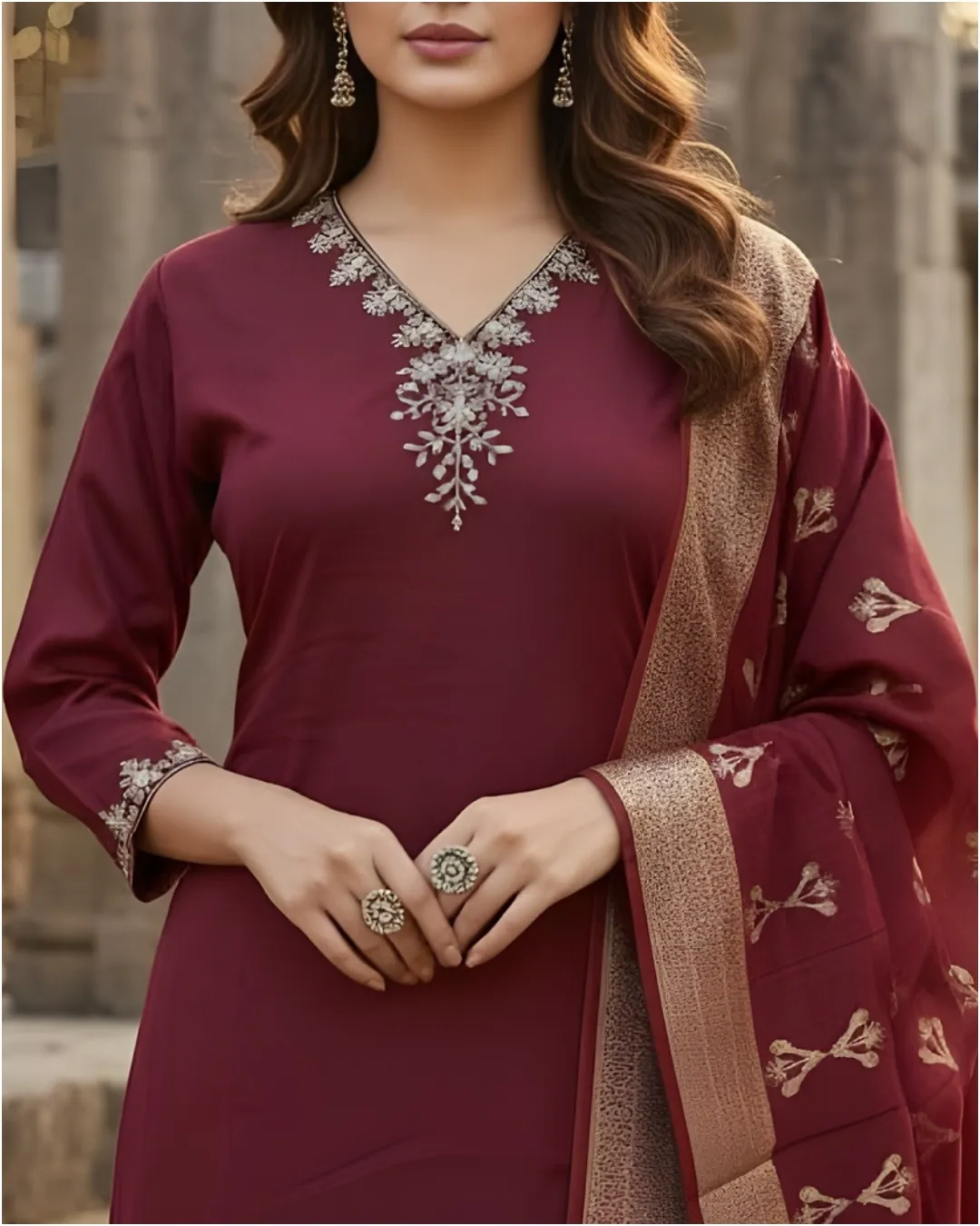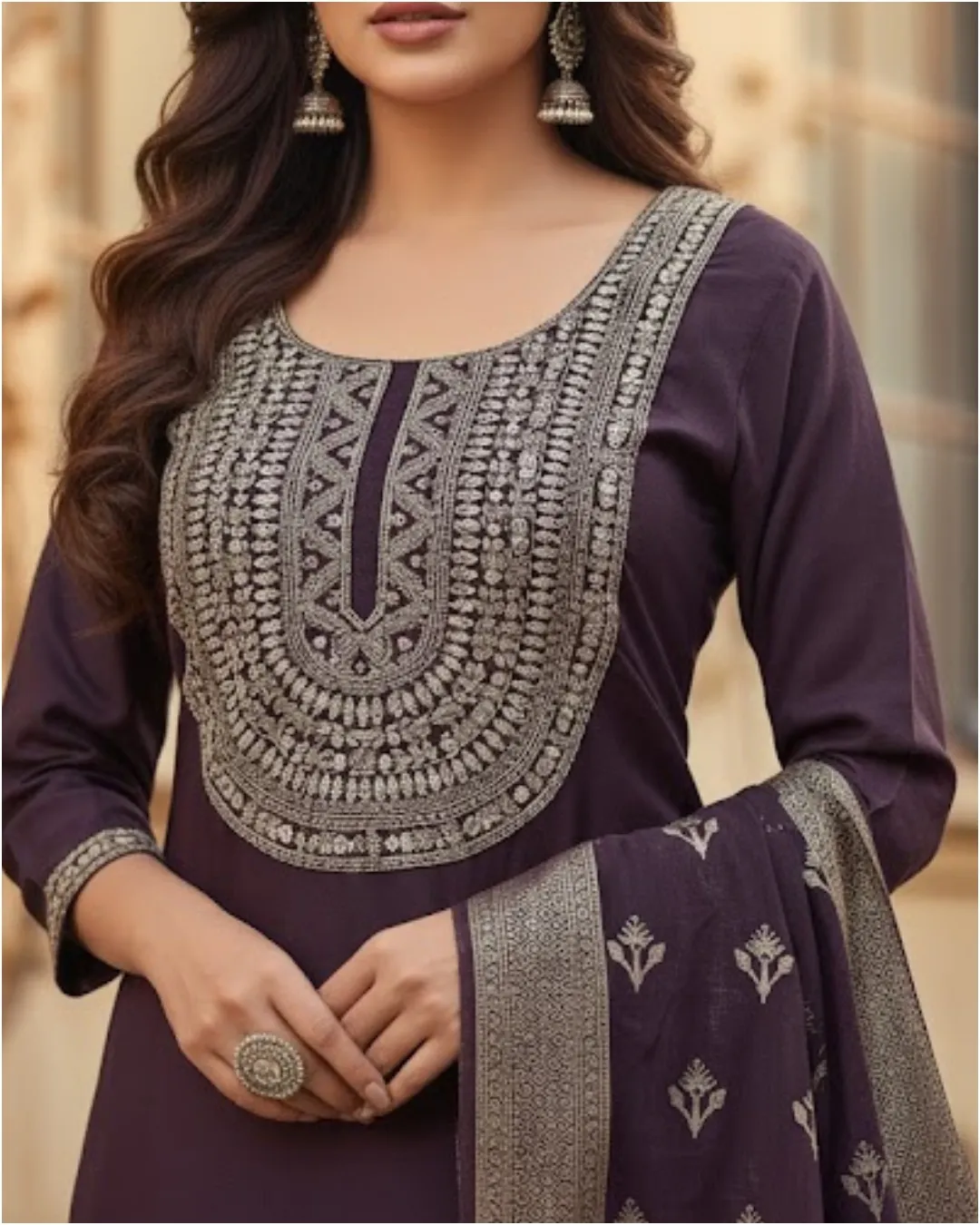 A timeless black kurta set designed for effortless elegance. Featuring delicate embroidery along the neckline and hem, paired with a beautifully textured dupatta that adds a subtle statement. Crafted for comfort and style, this outfit is perfect for festive evenings, family gatherings, or elegant everyday wear. Simple, graceful, and incredibly versatile.