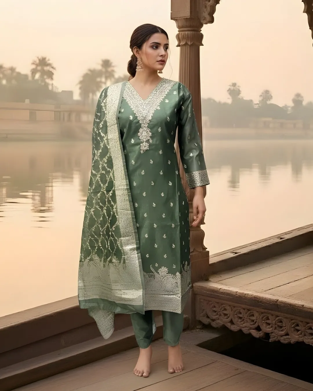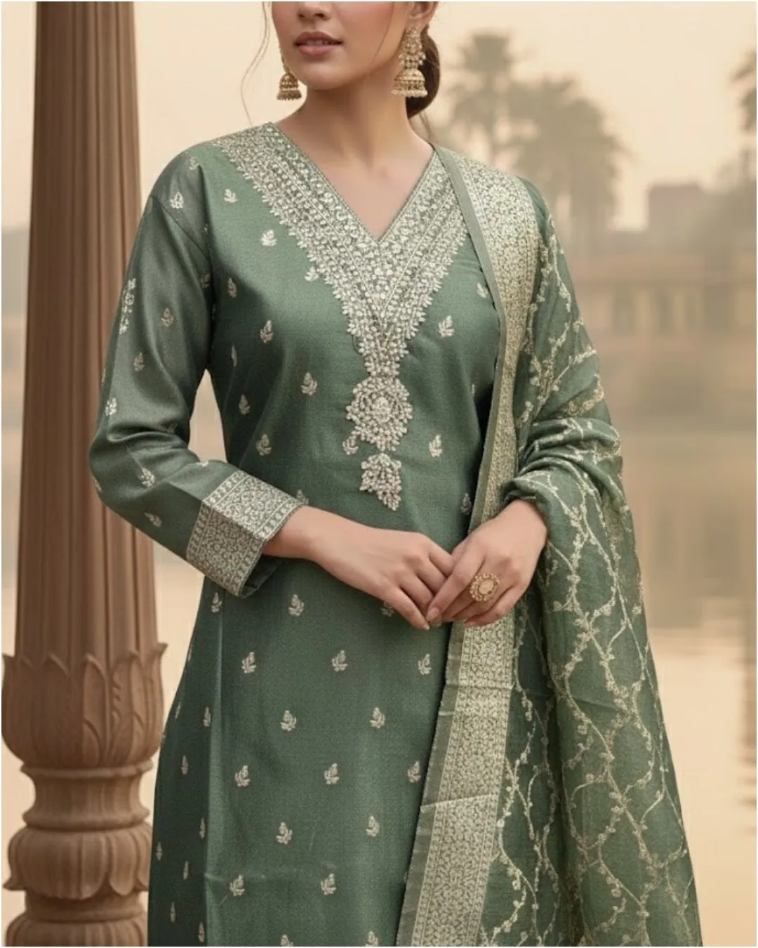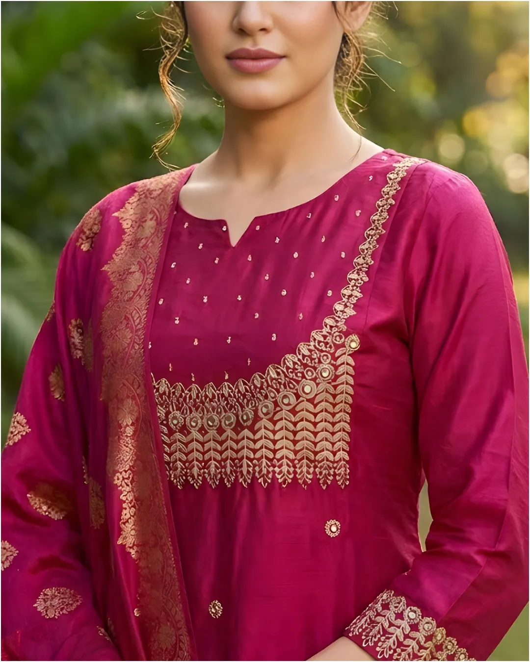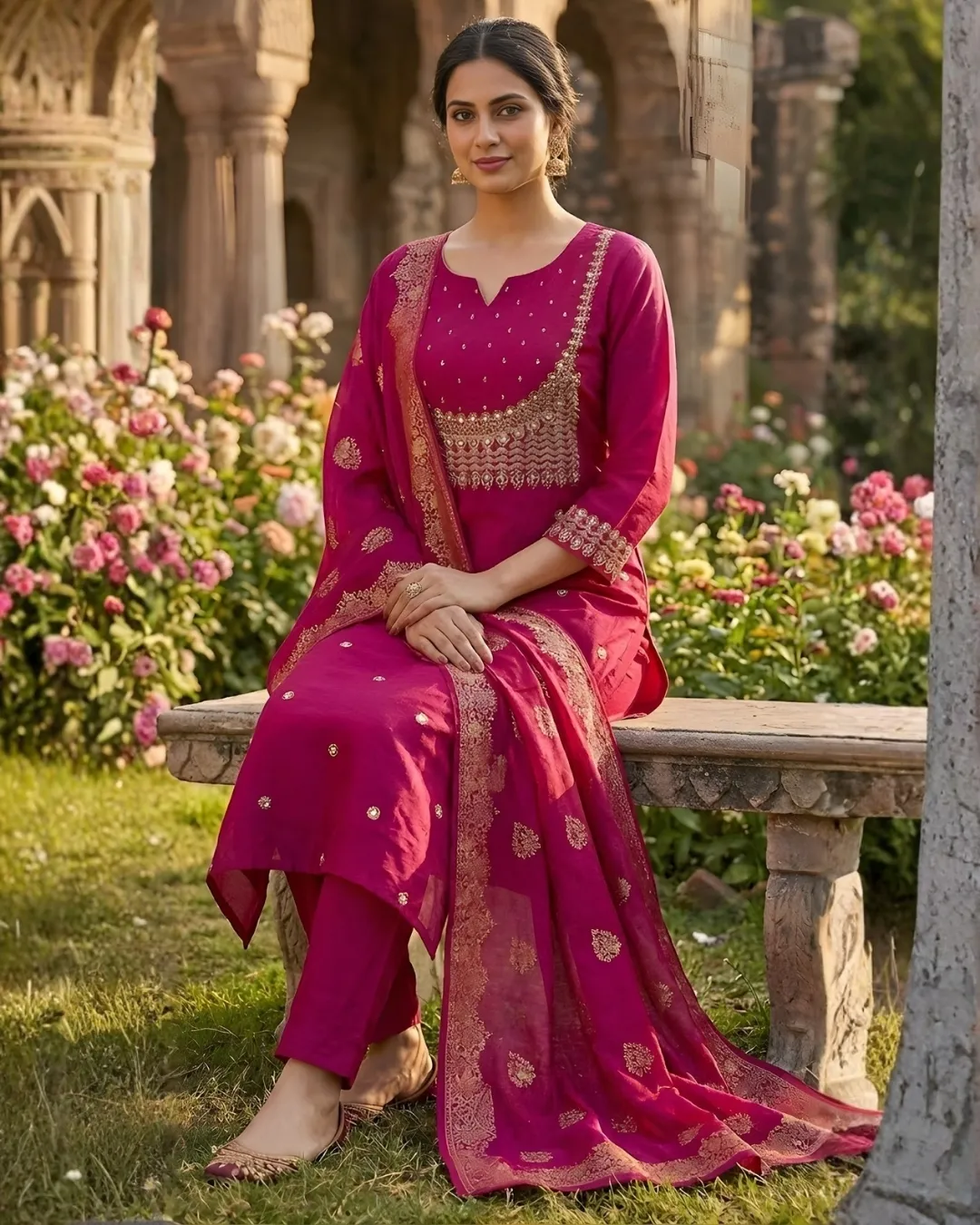 Drenched in a soft pink hue, this kurta set features intricate pastel embroidery on the yoke, enhanced with subtle shimmer accents across the fabric. Paired with straight-fit pants and a gracefully draped dupatta with scalloped edges, the ensemble captures effortless femininity and timeless charm—ideal for daytime celebrations, festive luncheons, and elegant summer gatherings.
